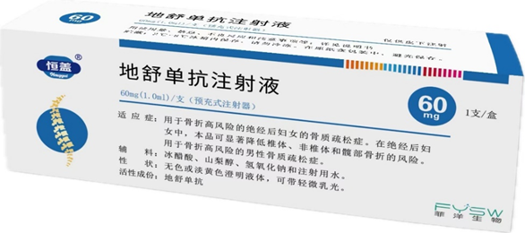 适应症: 用于骨折高风险的绝经后妇女的骨质疏松症。在绝经后妇女中,本品可显著降低椎体、非椎体和部骨折的风险; 用于骨折高风险的男性骨质疏松症; 用于治疗骨折高风险的糖皮质激素诱导的骨质疏松症。 规格:60mg(1.0ml)/支(预充式注射器)